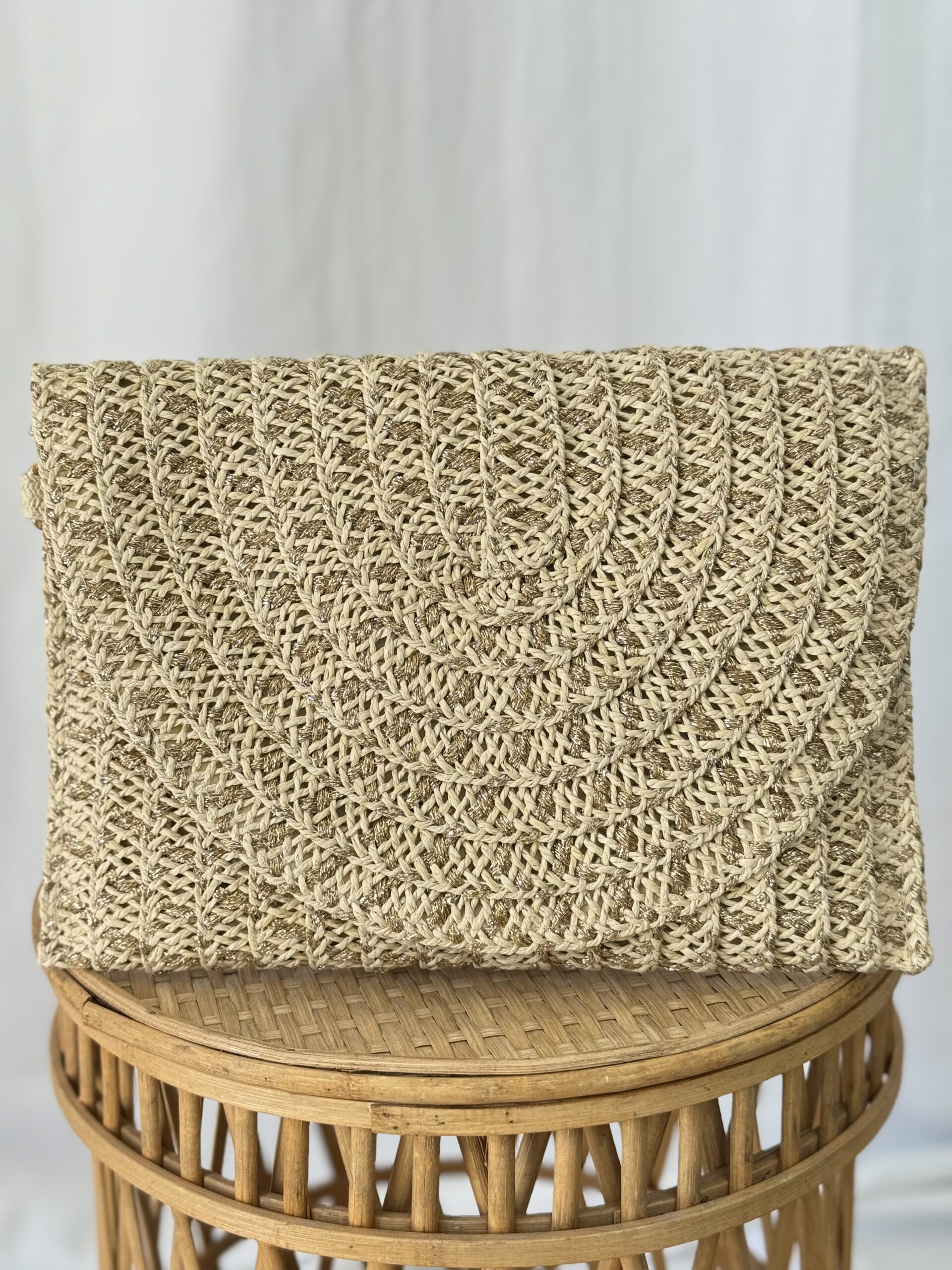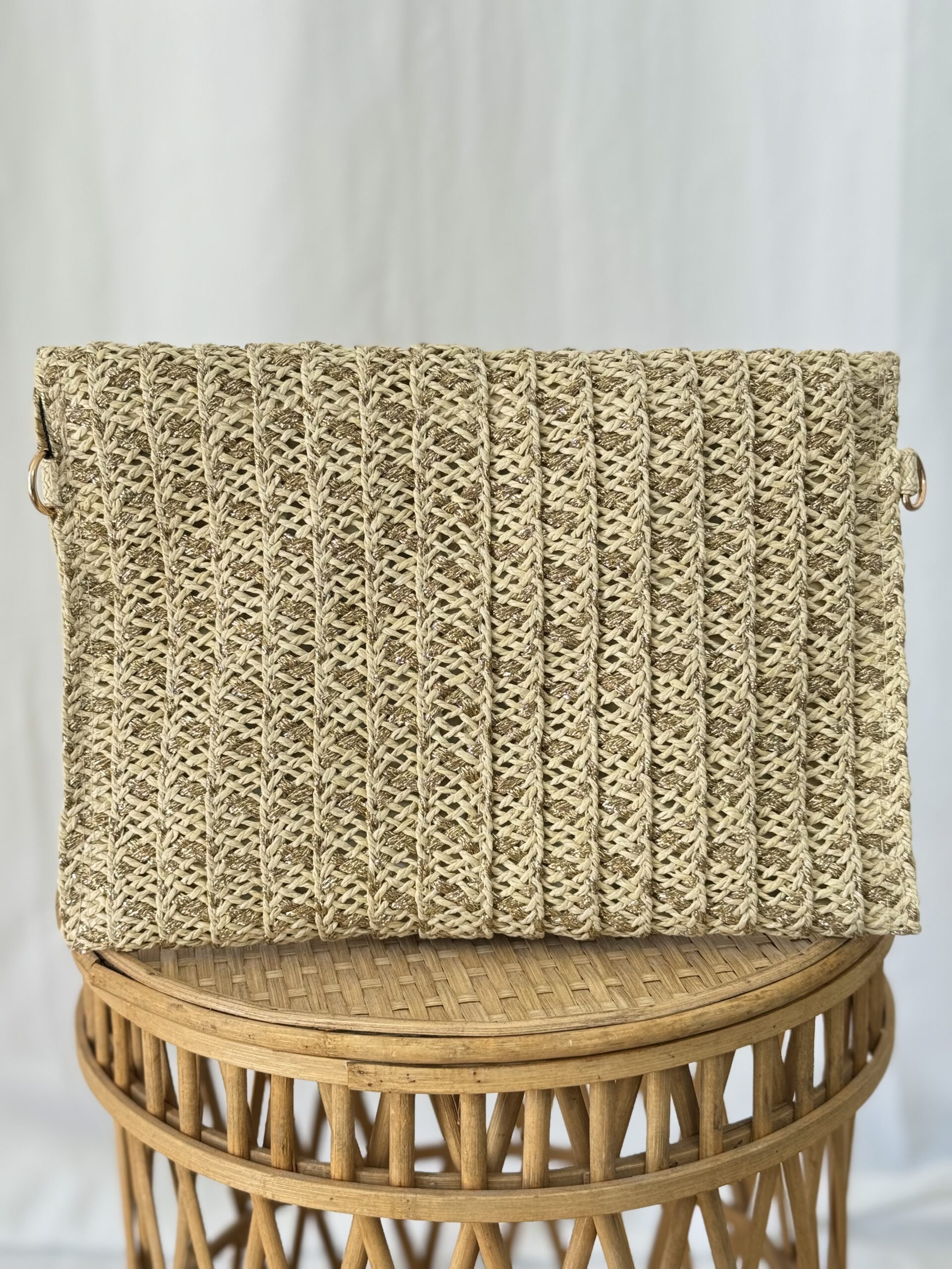 Bolso de rafia con hilo dorado que se puede llevar de mano y también incluye asa para colgar. Cierre magnético y de cremallera. Perfecto para combinar con todos tus looks.