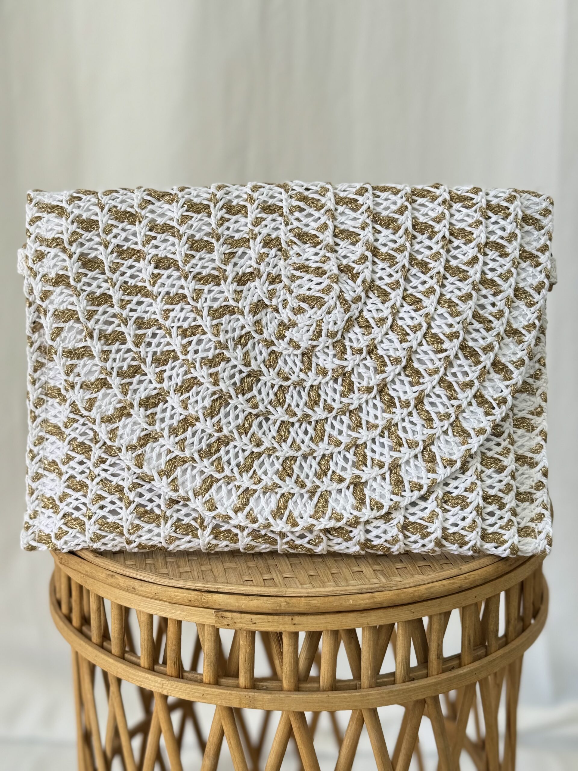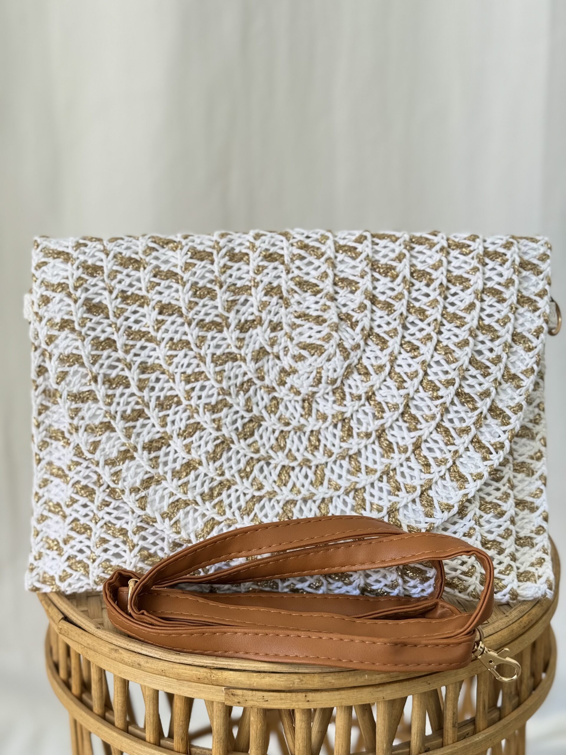 Bolso de rafia con hilo dorado que se puede llevar de mano y también incluye asa para colgar. Cierre magnético y de cremallera. Perfecto para combinar con todos tus looks.