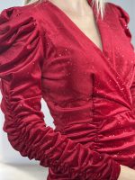 Vestido talla única. Es de terciopelo con brillito y va totalmente fruncido, el tejido es elástico y se ajusta muy bien a la figura. Incluye cascos para el pecho.