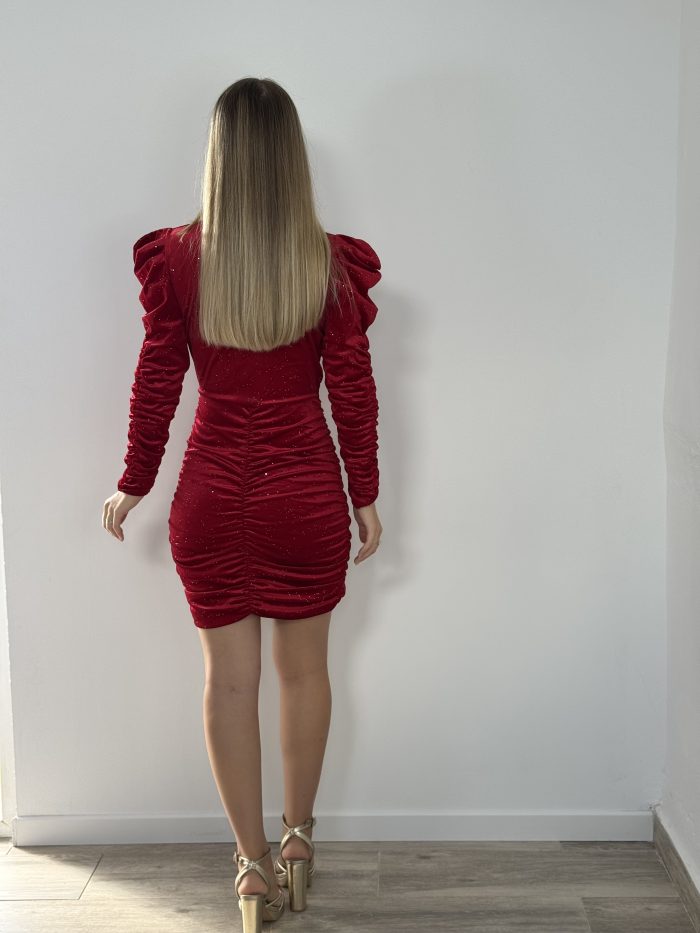 Vestido talla única. Es de terciopelo con brillito y va totalmente fruncido, el tejido es elástico y se ajusta muy bien a la figura. Incluye cascos para el pecho.
