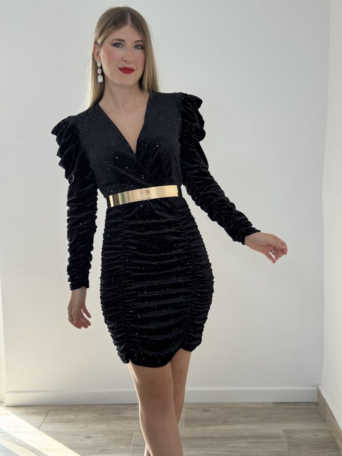 Vestido talla única. Es de terciopelo con brillito y va totalmente fruncido, el tejido es elástico y se ajusta muy bien a la figura. Incluye cascos para el pecho.